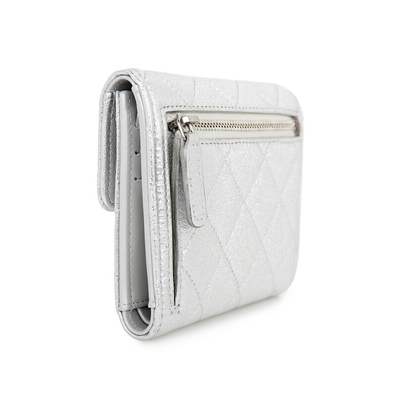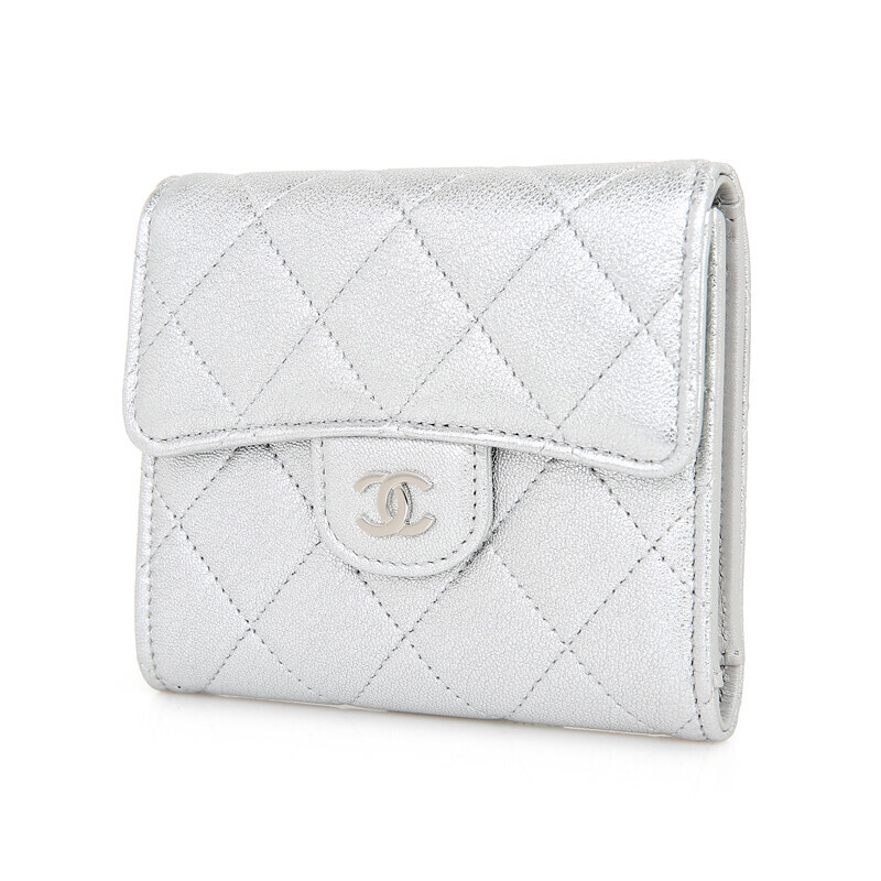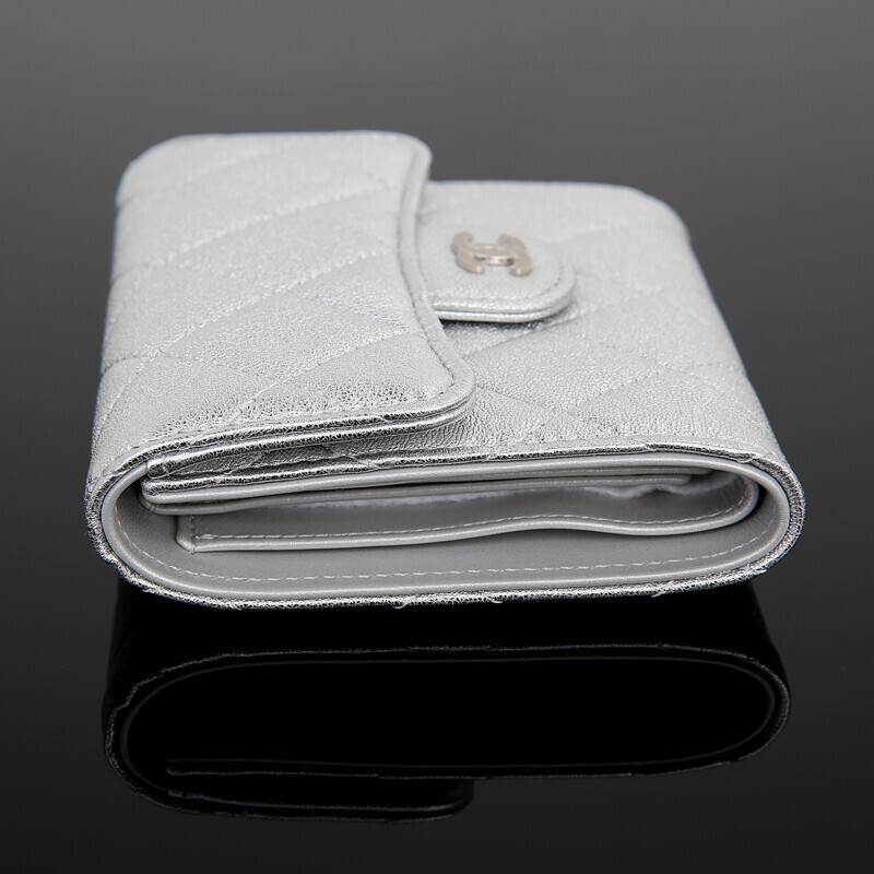 샤넬 쇼라인 메탈릭 실버 미러 카프레더 반지갑 여성지갑 3단지갑.
