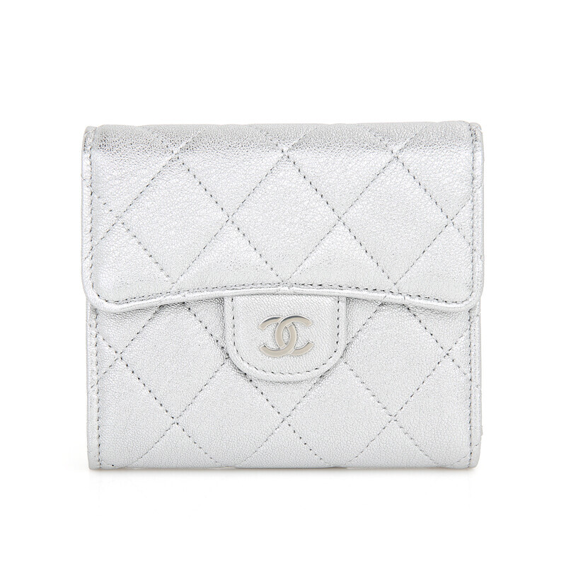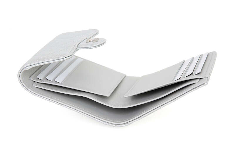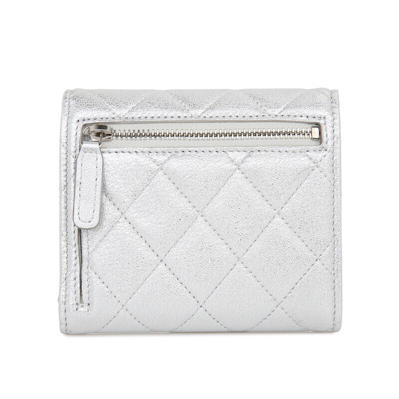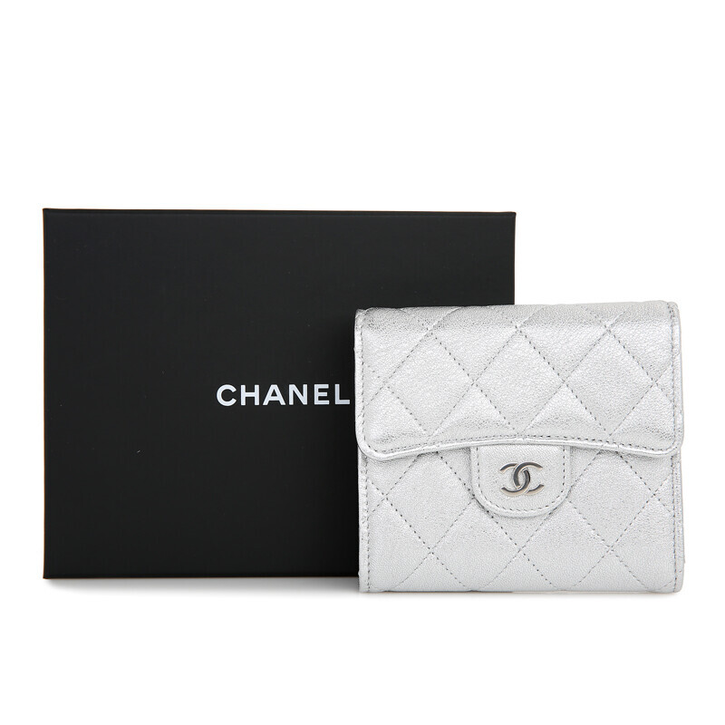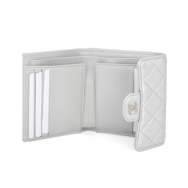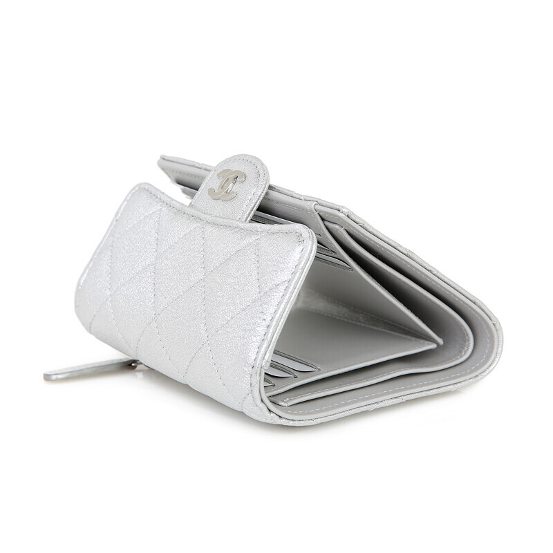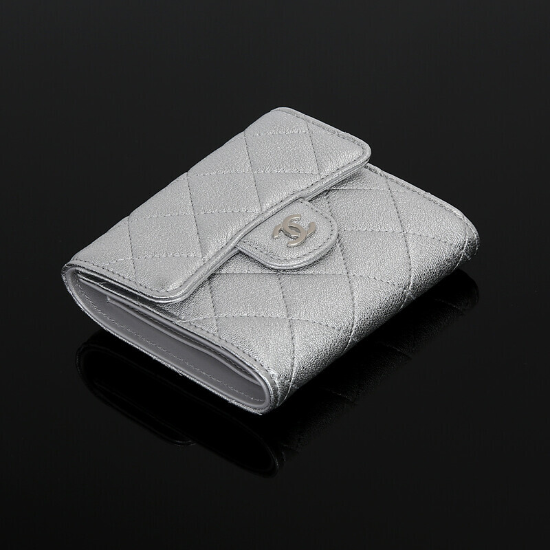 샤넬 쇼라인 메탈릭 실버 미러 카프레더 반지갑 여성지갑 3단지갑.