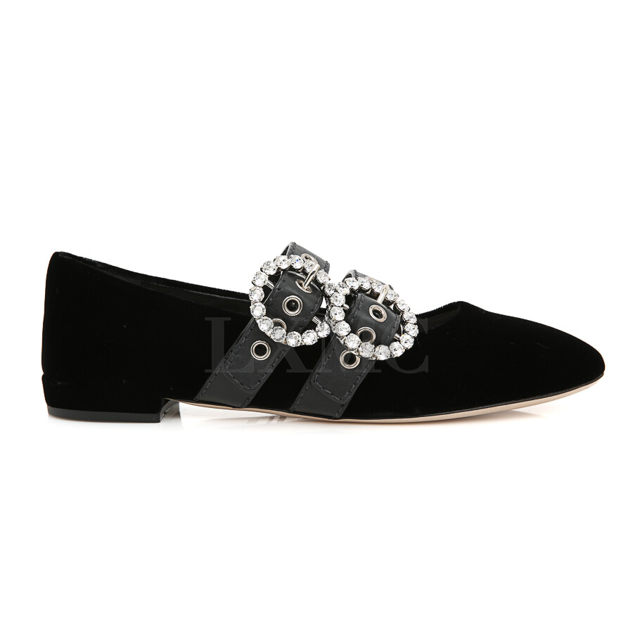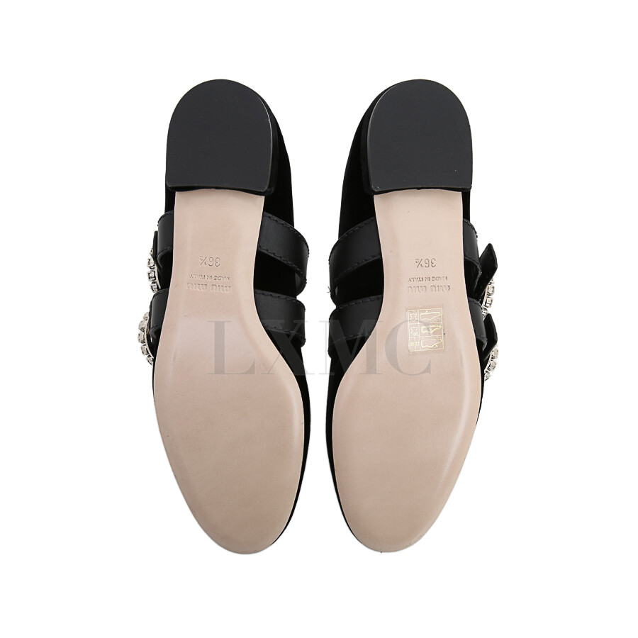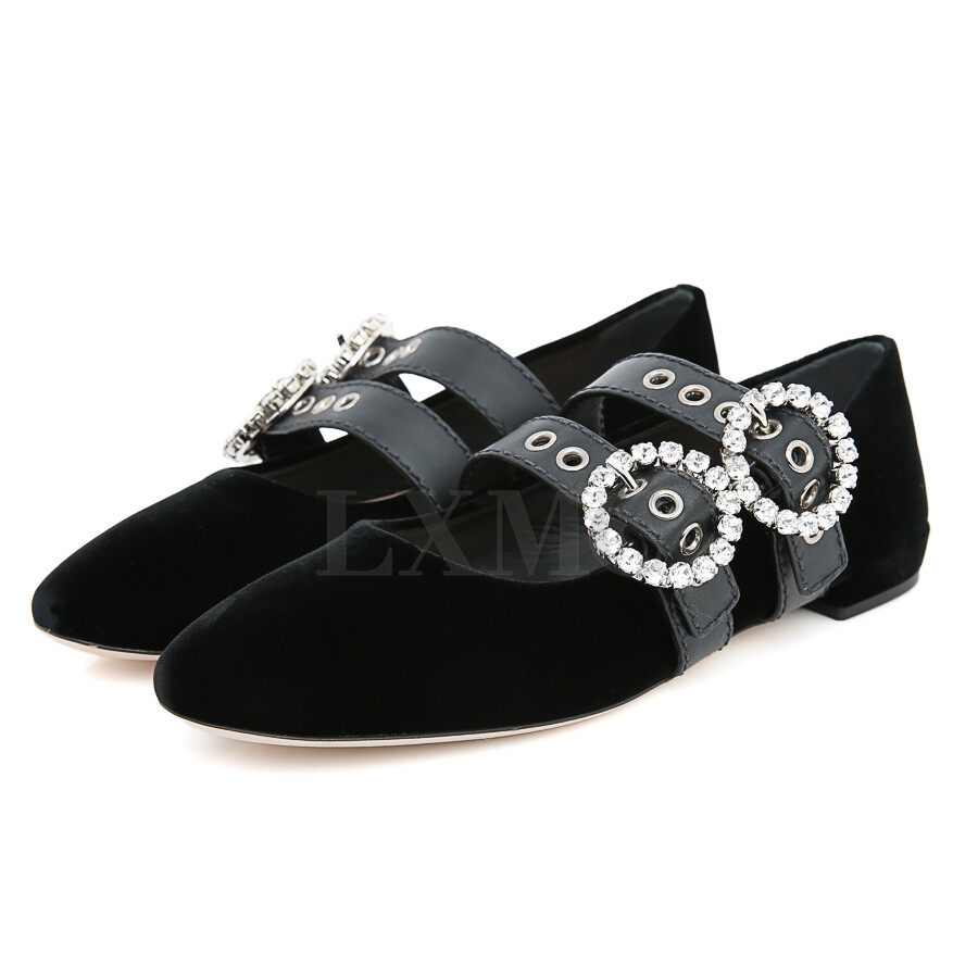 미우미우 발레리나 크리스탈 벨벳 플랫슈즈 블랙 버클 구두.